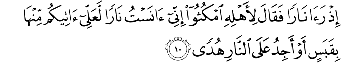 ʾidh raʾā nāran fa-qāla li-ʾahlihi mkuthū ʾinnī ʾānastu nāran laʿallī ʾātīkum minhā bi-qabasin ʾaw ʾajidu ʿalā n-nāri hudan