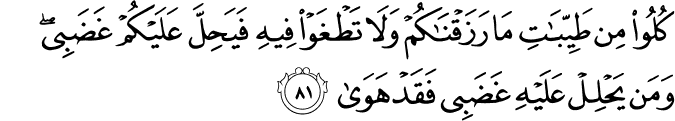 kulū min ṭayyibāti mā razaqnākum wa-lā taṭghaw fīhi fa-yaḥilla ʿalaykum ghaḍabī wa-man yaḥlil ʿalayhi ghaḍabī fa-qad hawā