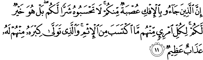 ʾinna lladhīna jāʾū bi-l-ʾifki ʿuṣbatun minkum lā taḥsabūhu sharran lakum bal huwa khayrun lakum li-kulli mriʾin minhum mā ktasaba mina l-ʾithmi wa-lladhī tawallā kibrahū minhum lahū ʿadhābun ʿaẓīmun