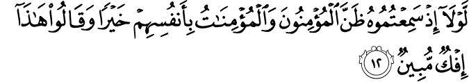 law-lā ʾidh samiʿtumūhu ẓanna l-muʾminūna wa-l-muʾminātu bi-ʾanfusihim khayran wa-qālū hādhā ʾifkun mubīnun