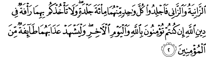 az-zāniyatu wa-z-zānī fa-jlidū kulla wāḥidin minhumā miʾata jaldatin wa-lā taʾkhudhkum bihimā raʾfatun fī dīni llāhi ʾin kuntum tuʾminūna bi-llāhi wa-l-yawmi l-ʾākhiri wa-l-yashhad ʿadhābahumā ṭāʾifatun mina l-muʾminīna