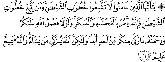 yā-ʾayyuhā lladhīna ʾāmanū lā tattabiʿū khuṭuwāti sh-shayṭāni wa-man yattabiʿ khuṭuwāti sh-shayṭāni fa-ʾinnahū yaʾmuru bi-l-faḥshāʾi wa-l-munkari wa-law-lā faḍlu llāhi ʿalaykum wa-raḥmatuhū mā zakā minkum min ʾaḥadin ʾabadan wa-lākinna llāha yuzakkī man yashāʾu wa-llāhu samīʿun ʿalīmun