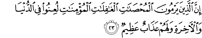 ʾinna lladhīna yarmūna l-muḥṣanāti l-ghāfilāti l-muʾmināti luʿinū fī d-dunyā wa-l-ʾākhirati wa-lahum ʿadhābun ʿaẓīmun
