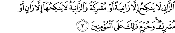 az-zānī lā yankiḥu ʾillā zāniyatan ʾaw mushrikatan wa-z-zāniyatu lā yankiḥuhā ʾillā zānin ʾaw mushrikun wa-ḥurrima dhālika ʿalā l-muʾminīna