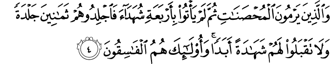 wa-lladhīna yarmūna l-muḥṣanāti thumma lam yaʾtū bi-ʾarbaʿati shuhadāʾa fa-jlidūhum thamānīna jaldatan wa-lā taqbalū lahum shahādatan ʾabadan wa-ʾulāʾika humu l-fāsiqūna