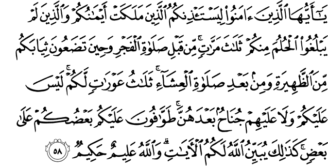 yā-ʾayyuhā lladhīna ʾāmanū li-yastaʾdhinkumu lladhīna malakat ʾaymānukum wa-lladhīna lam yablughū l-ḥuluma minkum thalātha marrātin min qabli ṣalāti l-fajri wa-ḥīna taḍaʿūna thiyābakum mina ẓ-ẓahīrati wa-min baʿdi ṣalāti l-ʿishāʾi thalāthu ʿawrātin lakum laysa ʿalaykum wa-lā ʿalayhim junāḥun baʿdahunna ṭawwāfūna ʿalaykum baʿḍukum ʿalā baʿḍin ka-dhālika yubayyinu llāhu lakumu l-ʾāyāti wa-llāhu ʿalīmun ḥakīmun