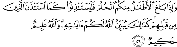 wa-ʾidhā balagha l-ʾaṭfālu minkumu l-ḥuluma fa-l-yastaʾdhinū ka-mā staʾdhana lladhīna min qablihim ka-dhālika yubayyinu llāhu lakum ʾāyātihī wa-llāhu ʿalīmun ḥakīmun