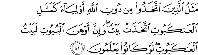 mathalu lladhīna ttakhadhū min dūni llāhi ʾawliyāʾa ka-mathali l-ʿankabūti ttakhadhat baytan wa-ʾinna ʾawhana l-buyūti la-baytu l-ʿankabūti law kānū yaʿlamūna