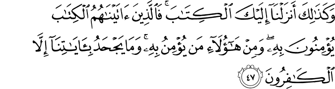 wa-ka-dhālika ʾanzalnā ʾilayka l-kitāba fa-lladhīna ʾātaynāhumu l-kitāba yuʾminūna bihī wa-min hāʾulāʾi man yuʾminu bihī wa-mā yajḥadu bi-ʾāyātinā ʾillā l-kāfirūna