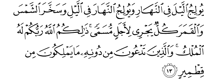 yūliju l-layla fī n-nahāri wa-yūliju n-nahāra fī l-layli wa-sakhkhara sh-shamsa wa-l-qamara kullun yajrī li-ʾajalin musamman dhālikumu llāhu rabbukum lahu l-mulku wa-lladhīna tadʿūna min dūnihī mā yamlikūna min qiṭmīrin