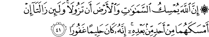 ʾinna llāha yumsiku s-samāwāti wa-l-ʾarḍa ʾan tazūlā wa-la-ʾin zālatā ʾin ʾamsakahumā min ʾaḥadin min baʿdihī ʾinnahū kāna ḥalīman ghafūran